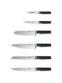 Dieses siebenteilige Messer-Set besteht aus zwei Schälmessern, einem Santoku-Messer, Kochmesser, Brotmesser, Tranchiermesser und einem Messerblock. Die Messer sind sicher im Messerblock fixiert, da dieser über eine integrierte Kindersicherung verfügt.